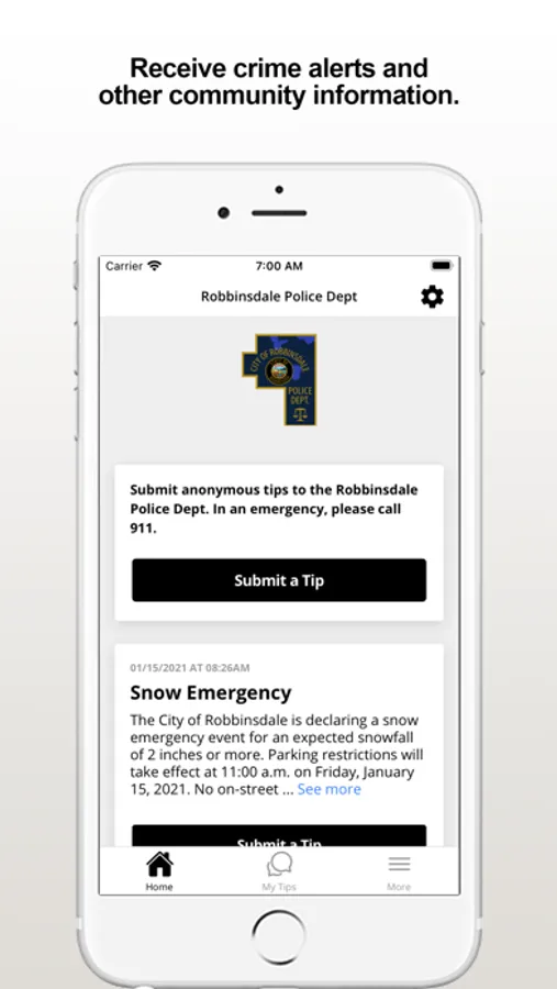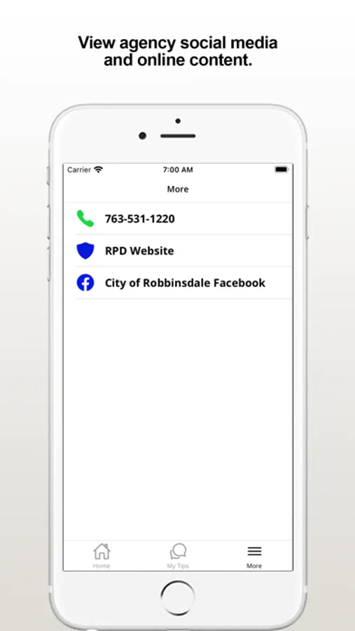 The Robbinsdale PD app provides citizens the ability to submit anonymous tips to the Robbinsdale, MN Police Department. The app also displays agency crime alerts and other organization web and social media content.