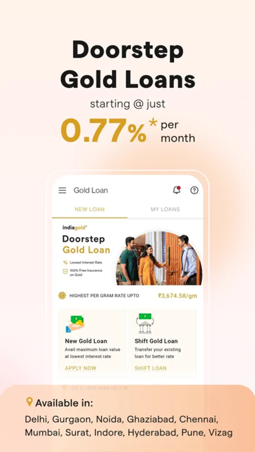 India's #1 Gold Loan App - Get loan in 20 minutes - Now in Delhi, Gurgaon, Noida, Faridabad, Ghaziabad, Indore, Surat, Mumbai, Chennai, Hyderabad, Pune & Vizag. Coming soon to all Indian cities.