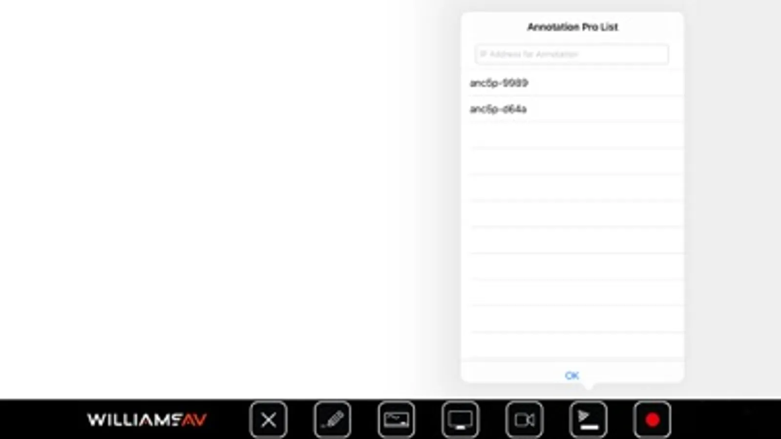 The Annotation Control app allows you to annotate from your iPad or iPhone. This app may only be used with the Williams AV Annotation Pro Plus annotation system. The Apple device being used must be on the same Wi-Fi network as the Annotation Pro system. Open the app and select the Connect icon. Find your Annotation Pro system in the list of available systems and select it. Once connected, draw with your fingers to make any desired annotations.