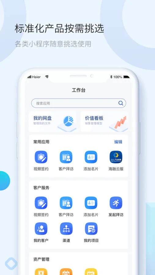 为更好地支持各小微生态圈的经营发展,按照“网络直销、交易驱动、集中运维、线上签约”的原则,为海尔产业金融打造互联网“移动办公”平台。
