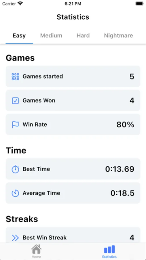 • Statistic: Keep track of your high scores, game started, win percentage and streaks.