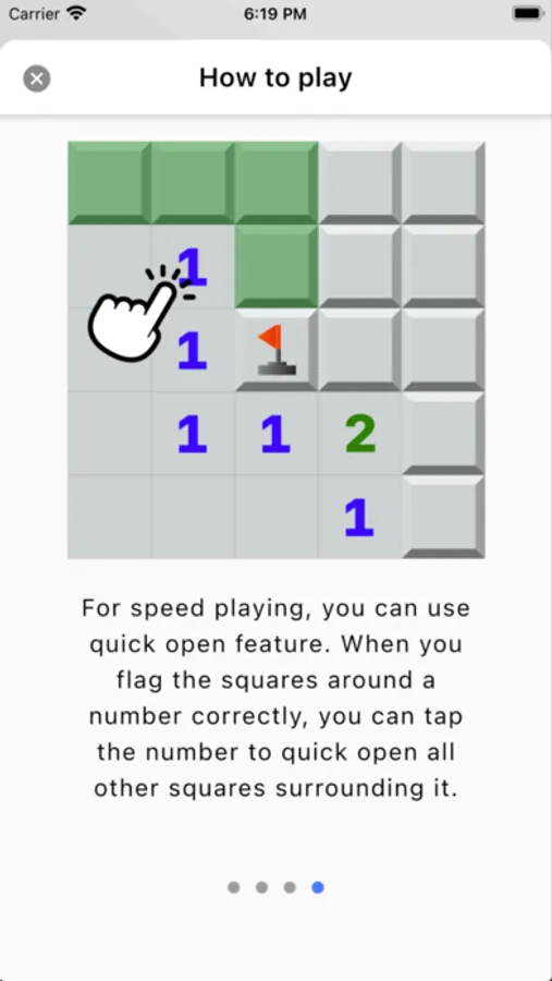 • For speed playing, you can use quick open feature. When you flag the squares around a number correctly, you can tap the number to quick open all other squares surrounding it.