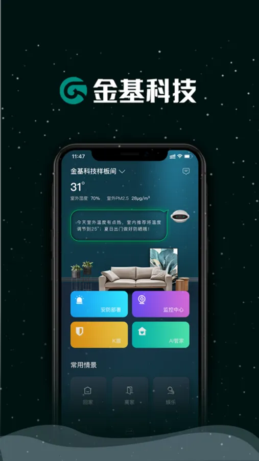 金基科技, 是以生活场景再塑造为导向,结合高端三恒系统,智能家居和物业服务,利用云计算、大数据分析、语音识别、语义理解和人工智能等技术,为用户提供更加便捷、安全、舒适生活的一款应用。