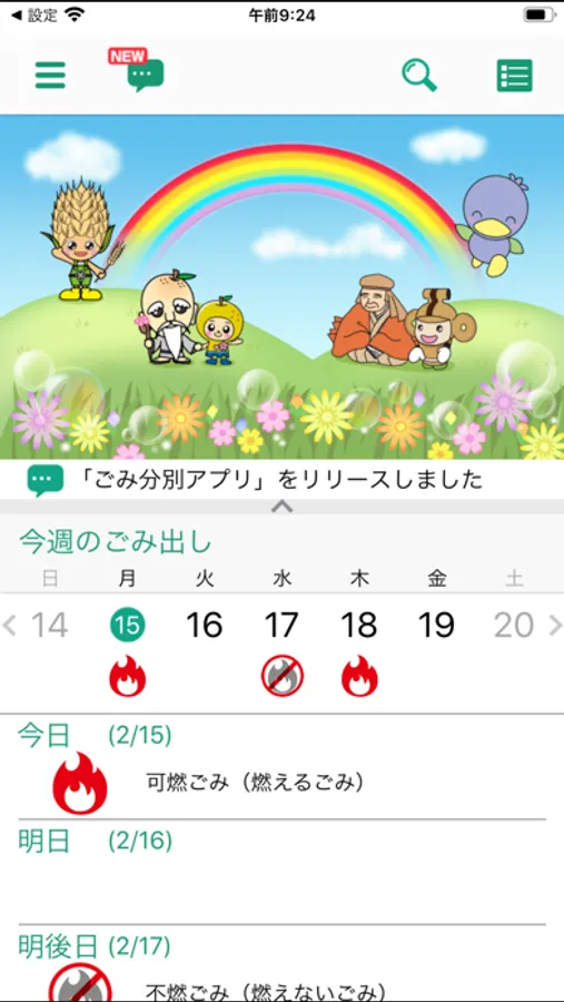 収集日変更のお知らせやイベント情報などを確認することができます。