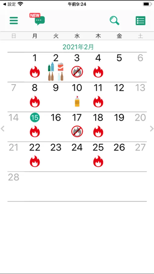 収集予定のごみ種別を前日と当日にアラートでお知らせします。時間は自由に設定することができます。
