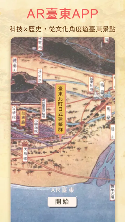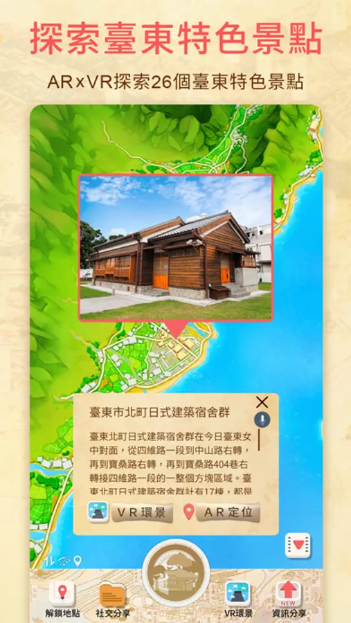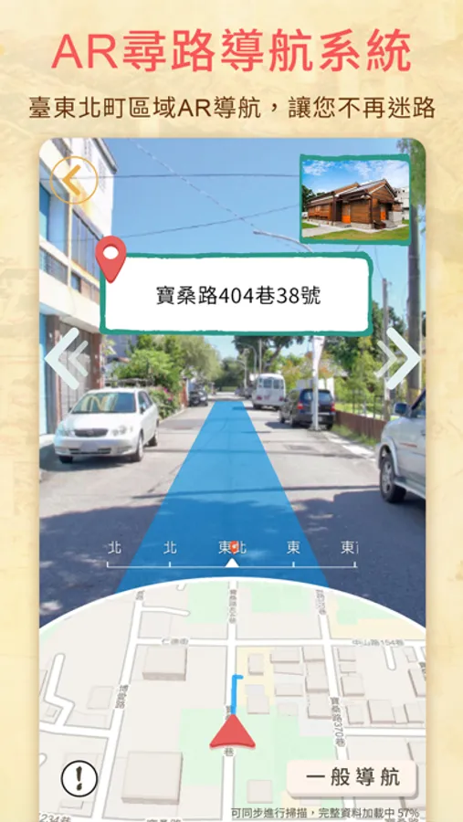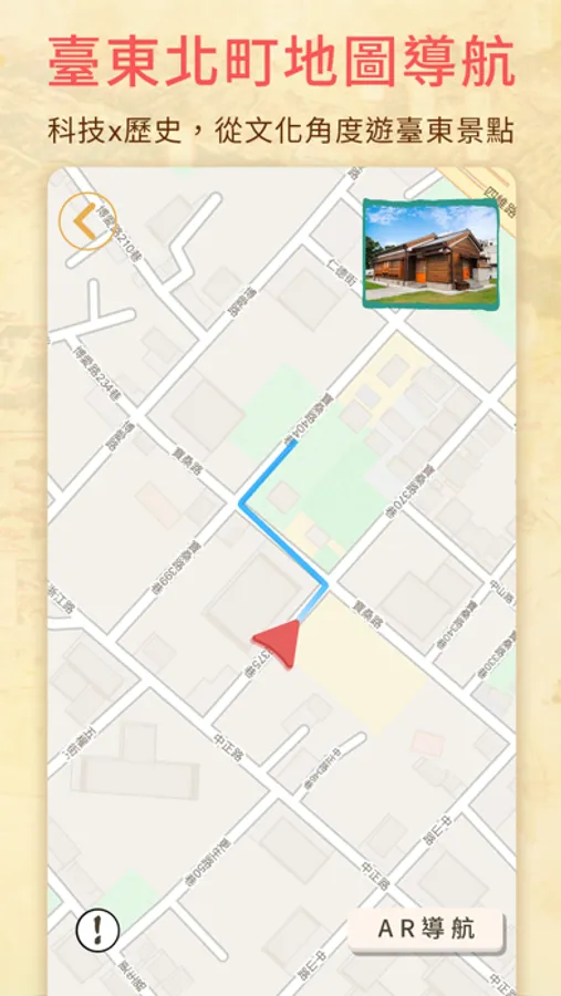 此功能主要服務於「臺東市民權里日式建築宿舍群」景區,會開啟相機功能,可以通過畫面中的引導路線至目標景點,更加直觀地指認出應該要前往的路徑方向。