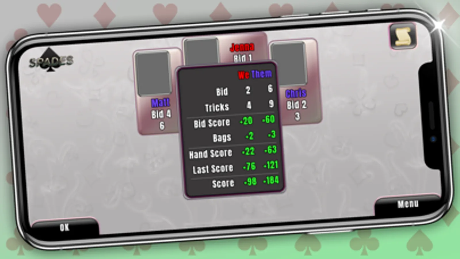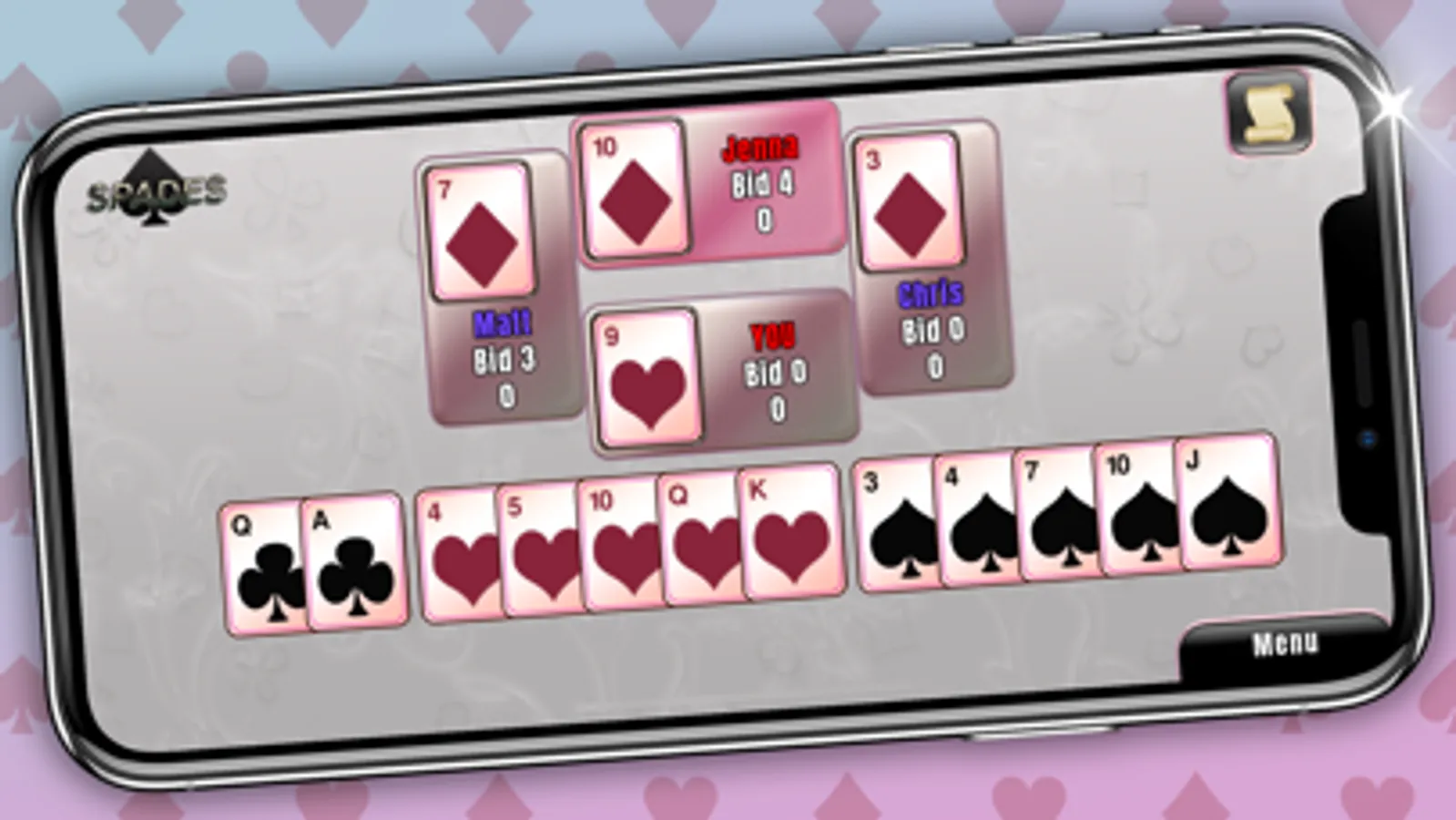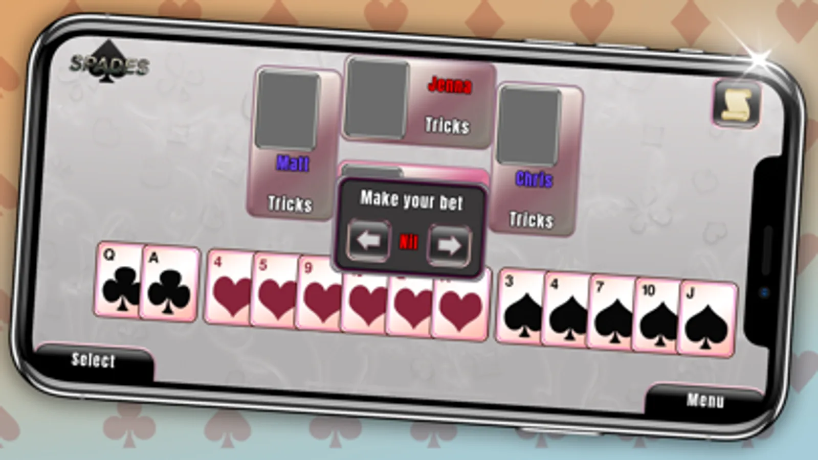 The goal of Spades is to reach 500 points with your team. Players sitting opposite each other play as a team. The game begins with a round of bidding. You try to predict the number of "tricks", or turns, you will win. The combined bids of two partners make a "contract". Once the bidding is completed, the partners must fulfill their contract, not the individual bids. You make a contract by winning at least a contracted number of tricks. A bid of Nil means the player will try not to win any tricks. The "trump" (or highest value) suit is always Spades. Each contracted trick is worth 10 points. If you fail to fulfill the contract, a penalty is the entire value of that contract. Each overtrick, or taking more than you bid, is worth 1 point and also earns you one "bag". Every set of 10 "bags" incurs a 100-point penalty. Winning a Nil bid is worth 100 points, failing a Nil bid is penalized by 100 points.