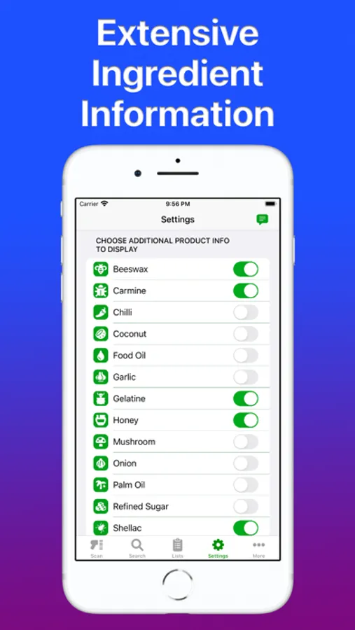 *Allergens and dietary needs covered by the app: beeswax, carmine, chilli, coconut, dairy, egg, fish, food oil, garlic, gelatine, gluten and wheat, honey, lupin, mushroom, onion, peanut, sesame, shellac, shellfish, soy, silk, sulphites, tree nuts, wool.