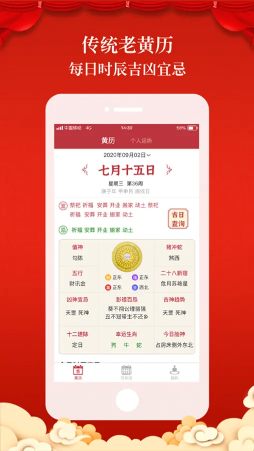 正版老黄历,不仅有信息量丰富的黄历,农历,万年历,更有运势测算,节假安排,是功能多样,贴心实用的老黄历。