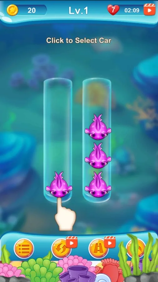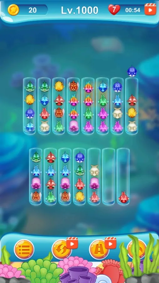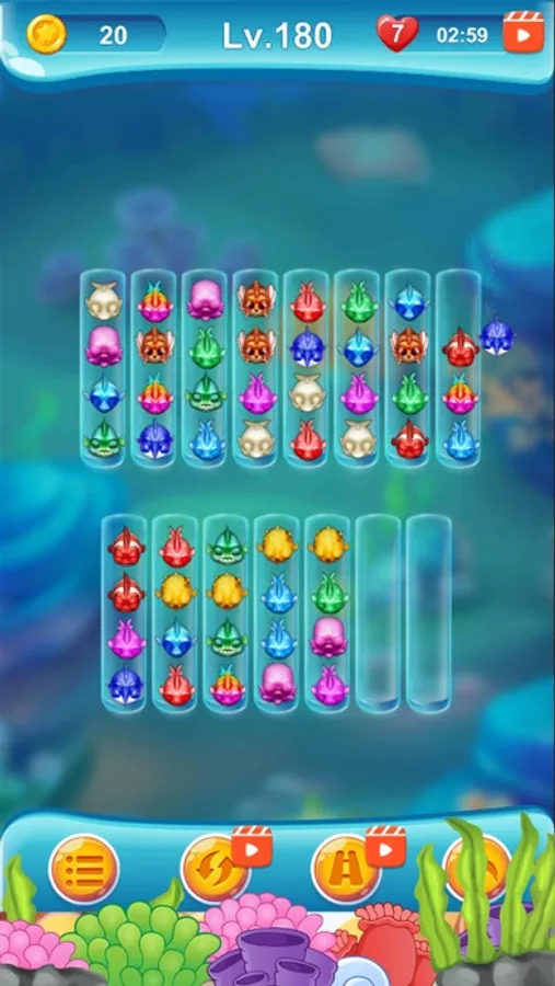水槽の中の魚のプラグを分類してみてください。魚をタップし、計画的な方法で、水槽の一番上の魚を別の水槽に割り当てます。二つの魚が同じ色をしていて、移動する水槽に十分なスペースがある場合は、魚は他の魚の上にのみ移動できます。途中で引っかからないようにステップを計画してください。ただし、心配しないでください。いつでもレベルを再開して、前のステップに戻ることができます。同じ色のすべての魚が同じ水槽に留まるまで、ステップ数制限なく自分のペースで自由にプレイできます。