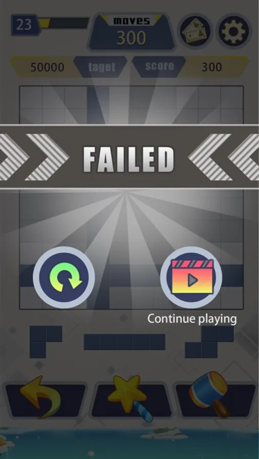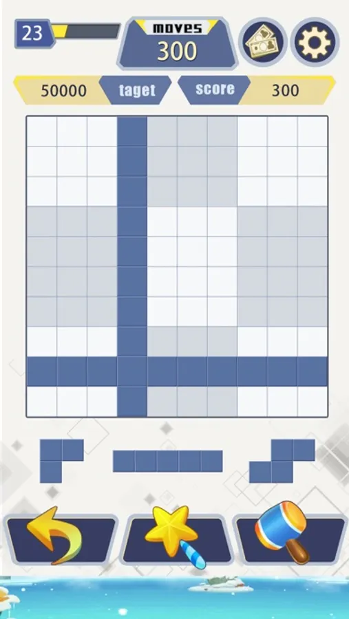 待機区域から、“ブロック”を消去する区域にドラッグします。行または列全体が小さな正方形で埋められたら、それを消去できます(行または列が消え、残りの正方形の位置は変更されません)。 待機区域にブロックを配置できない場合、ゲームは失敗します。