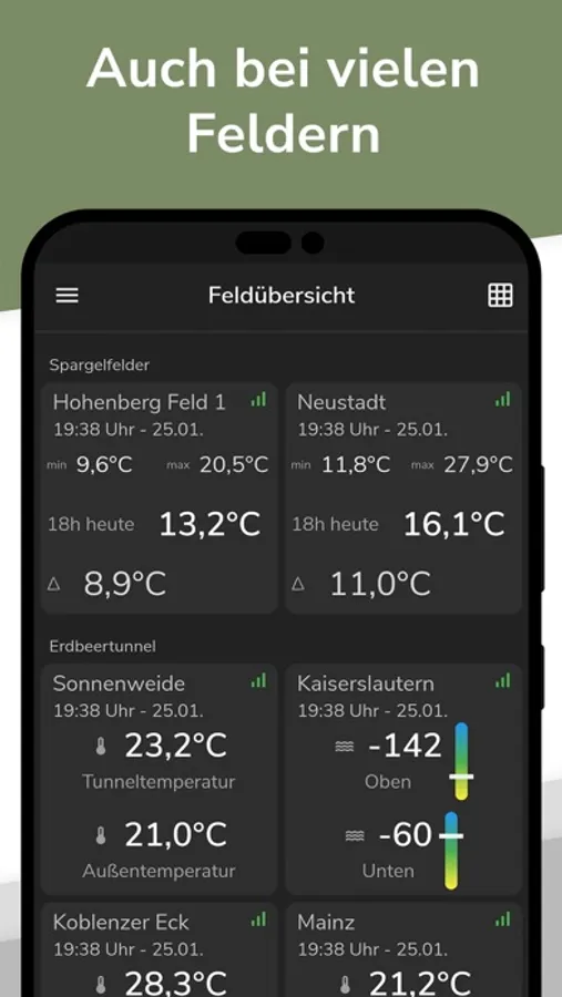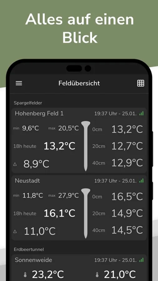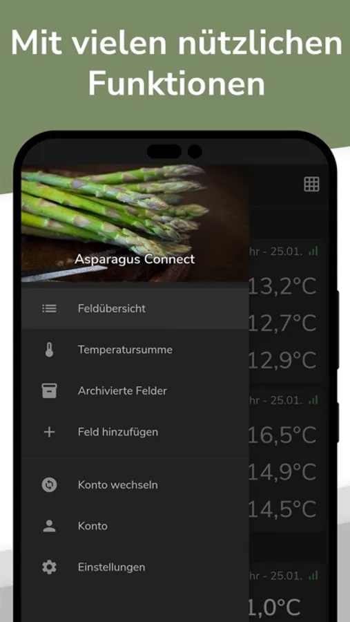 Mit Asparagus Connect haben Sie die Temperatur auf Ihren Spargelfeldern immer im Blick. Ob als App auf dem Handy oder auf dem Desktop – wir liefern Ihnen Temperaturdaten, Temperaturverläufe und Temperatursummen. Damit Sie sich ganz auf Folienmanagement und Ernte konzentrieren können.