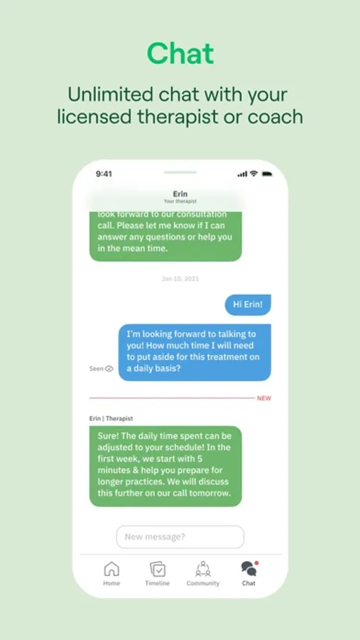 1. Up to four face-to-face therapy sessions, via video call, plus unlimited support via in-app chat—all with a licensed therapist who will be with you for the duration of the program.