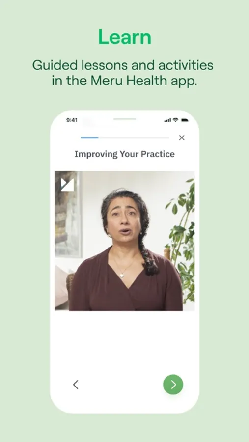 The Meru Health app enhances your care experience with guided, evidence-based lessons and activities that you can do on your own or with support of your therapist or coach.