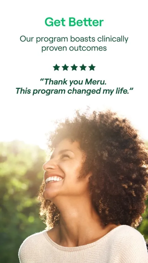 After program completion, 73% of Meru participants show clinically significant improvement, and 59% are in remission from symptoms of depression or anxiety. This exceeds the 12-week outcomes of traditional approaches to mental health care.