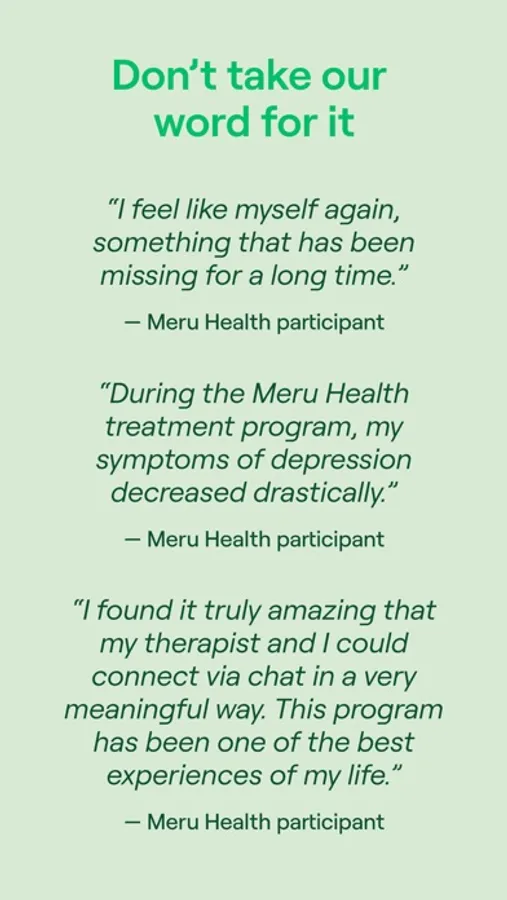 Meru Health is mental health care with continuous support from a licensed therapist, via both video calls and unlimited in-app chat. Mental health doesn’t wait for the calendar—neither should your mental health care.