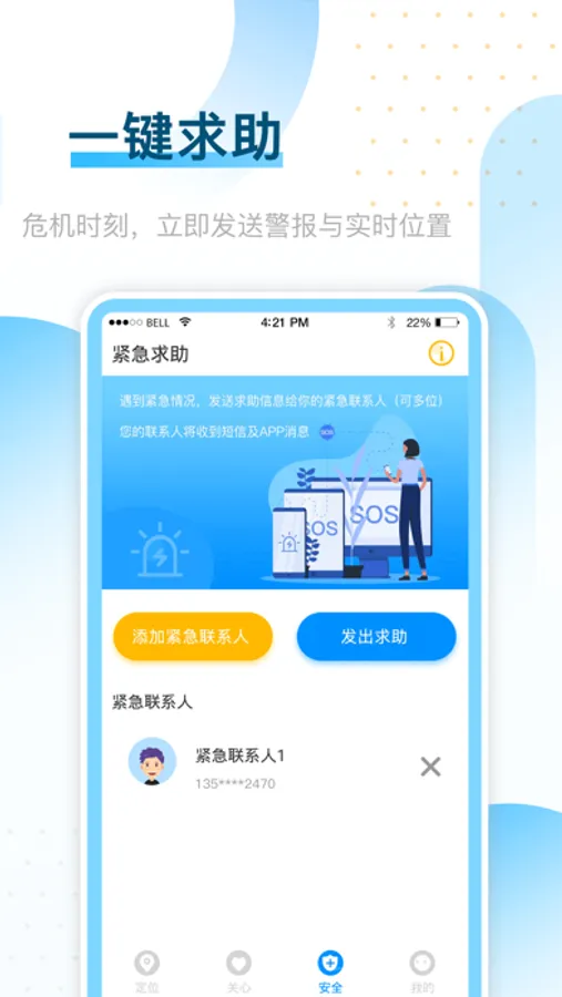 紧急求助:遇到紧急事件,一键求助,一键向家人发出求助信息。