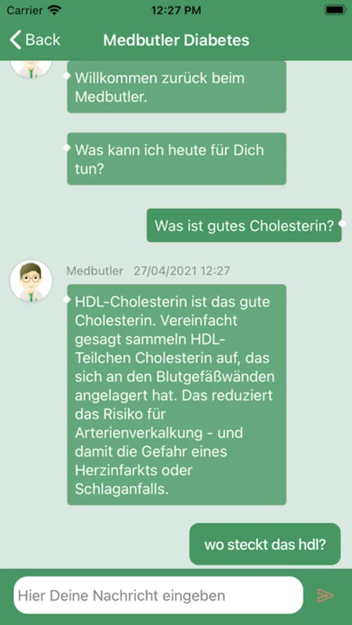 Medbutler ist Dein persönlicher Coach und Assistent für das Thema Diabetes-Typ-2. Lasse Dich in den ersten Tagen nach Deiner Diagnose vom Medbutler coachen. Oder stelle Fragen zu allen Themen rund um Diabetes-Typ-2.