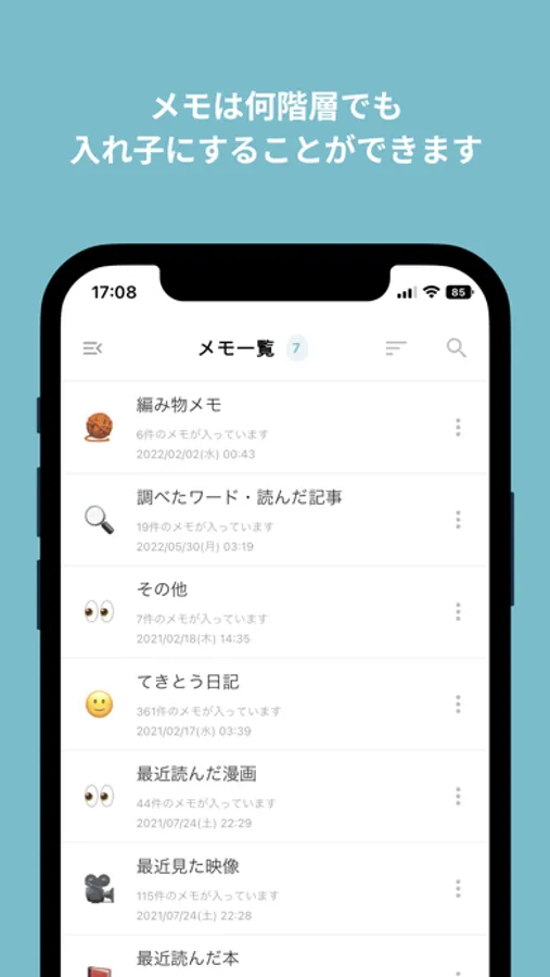 フォルダやカテゴリ分けはありません。全てのメモを入れ子構造で収納する事が可能で、全てのメモがフォルダでありメモ自体として機能します。