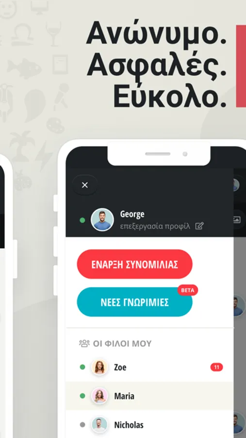 Στις συνομιλίες σας μπορείτε να ανταλλάσσετε φωτογραφίες και ηχητικά μηνύματα ή ακόμα και να κάνετε βίντεο-κλήση. Εφόσον το επιθυμείτε, μπορείτε οποιαδήποτε νέα γνωριμία σας να την προσθέσετε στην λίστα φίλων σας για να κρατήσετε μόνιμη επαφή.