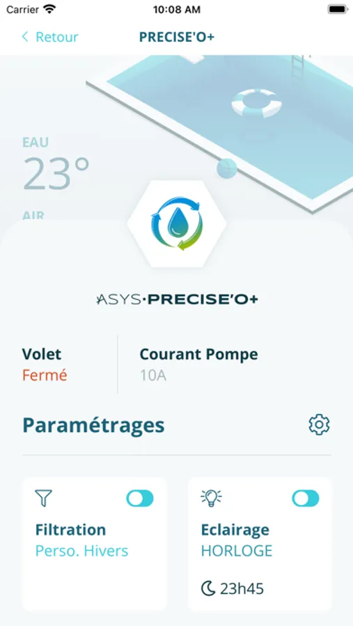 PRECISE’O+, vous permet de piloter la filtration, l’éclairage du bassin. D’un simple clic sur votre smartphone ou tablette, vous pourrez depuis chez vous effectuer des réglages nécessaires pour un fonctionnement optimal.