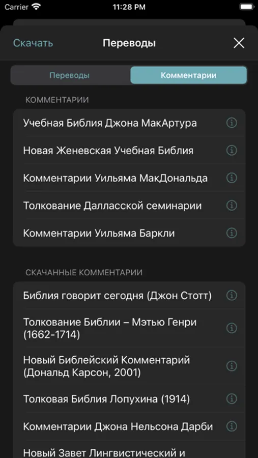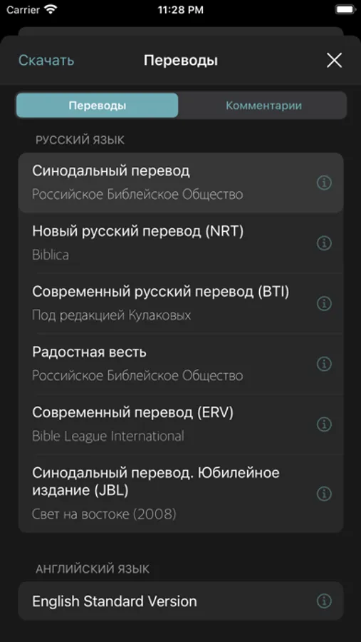 . Для детального изучения Библии предусмотрен режим, войдя в который можно прочитать все имеющиеся переводы и комментарии к текущему стиху.
