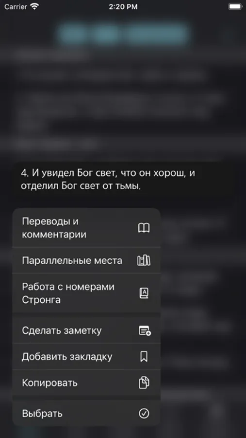 . Возможность выбрать сразу несколько стихов и скопировать. Для этого следует выбрать стих долгим нажатием и нажать на пункт "Выбрать", после чего выбрать другие необходимые стихи.