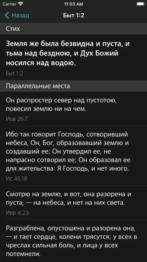 . Параллельные места к каждому стиху. Чтобы посмотреть параллельное место, нужно произвести долгое нажатие на стих и выбрать "Параллельные места". Откроется экран со всеми параллельными местами (Места взяты из "The Treasury of Scripture Knowledge")