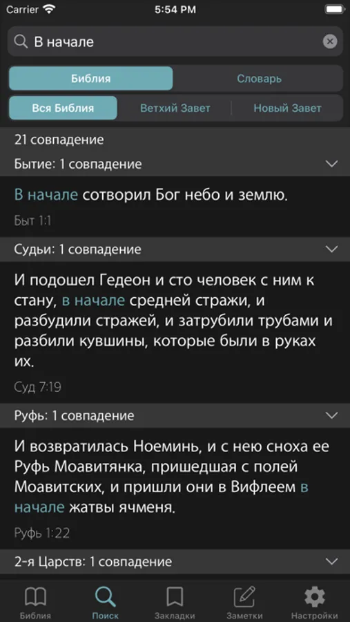. Присутствует удобный поиск по всей Библии или только по Ветхому / Новому завету.