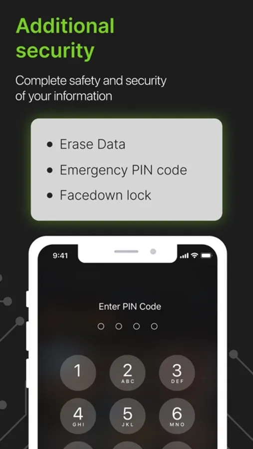 • Additional security: Erase Data, Emergency PIN Code and Facedown Lock!