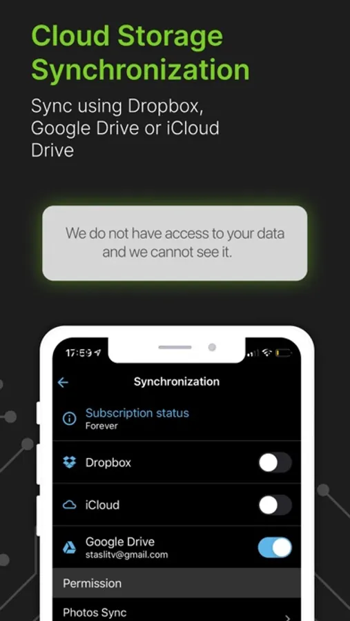 We guarantee that your personal data is not sent to the network, is not stored or processed on our servers; therefore, we provide the ability to use your personal cloud storage for synchronization, thereby eliminating the possibility of access to your data by third parties, while maintaining privacy, simplicity use and the ability to quickly recover. To ensure the safety of your data, we strongly recommend that you always use synchronization with your cloud storage.