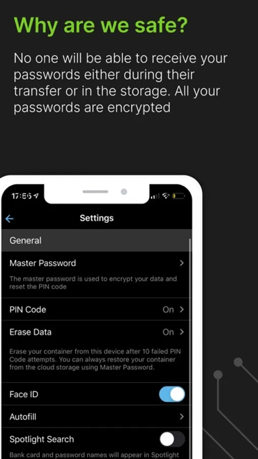 We do not store your master password. Any access to your data is carried out using a unique personal secret key generated based on your master password and stored in iOS keychains. No one else will be able to receive or read this data either during its transmission or in the storage.