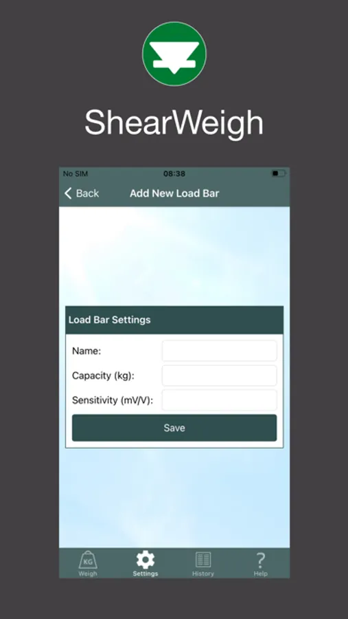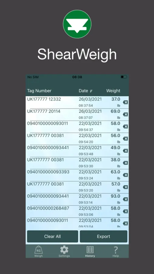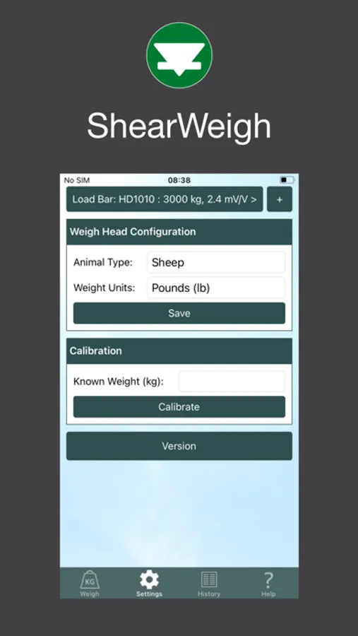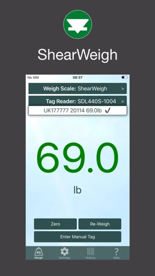 The app connects to the ShearWeigh Weigh Head using Bluetooth LE and provides these functions: