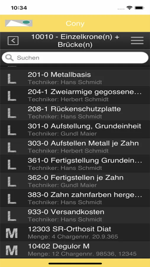 Auftragszeilen können begutachtet, neue Leistungen und Material hinzugefügt, Chargennummern und Materialmengen angepasst sowie Techniker zugeordnet werden.