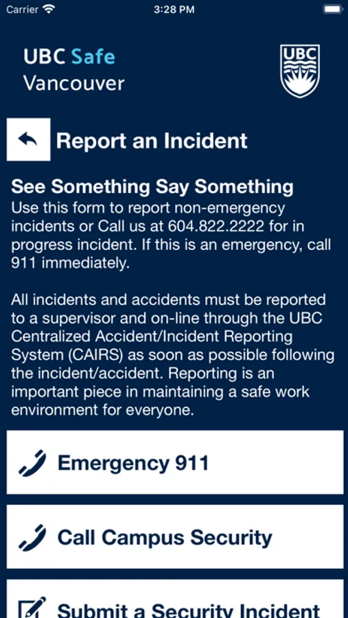 - Tip Reporting: Multiple ways to report a safety/security concern directly to UBC Vancouver security.
