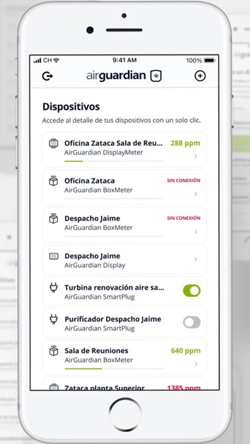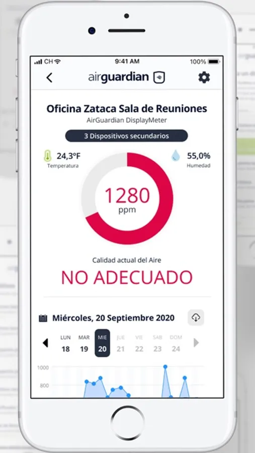 Las mediciones que realiza el dispositivo AirGuardian, se reflejan en la aplicación de forma continua, enviando alertas cuando los niveles de CO2 son superiores a los máximos recomendados, de forma que la ventilación de las estancias se haga de forma correcta, brindándote la posibilidad de mantener seguros los lugares cerrados, con un control absoluto de la situación.