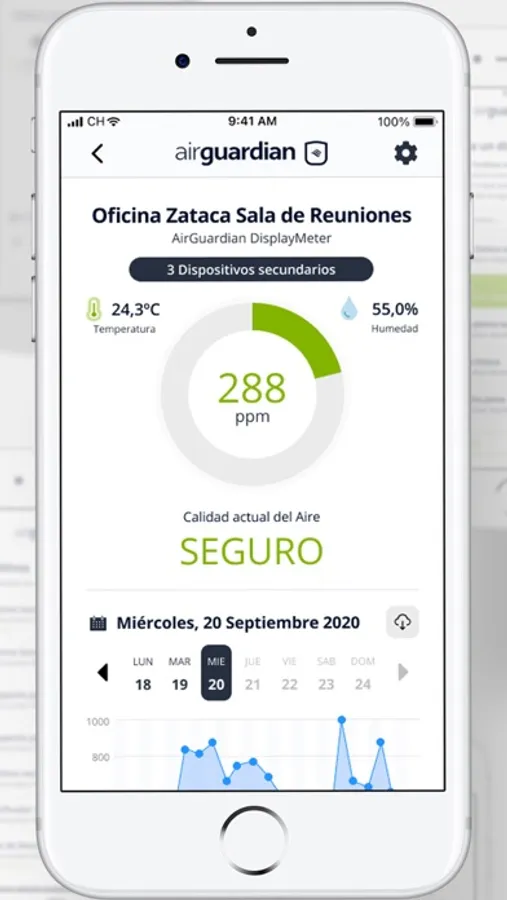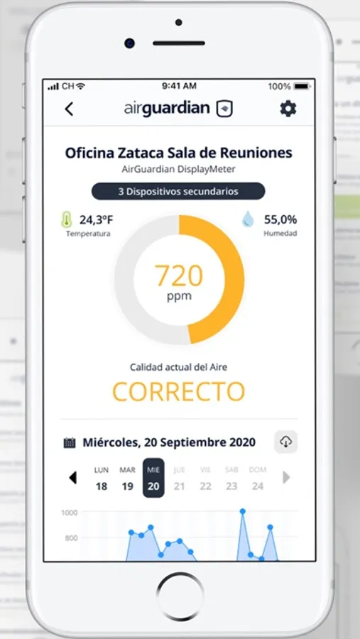 Podrás ver cómo cambia de color el dispositivo AirGuardian cuando los niveles de CO2 aumentan pero con la app, además podrás compartir dichas mediciones con las personas que elijas, a través de correo electrónico, o envíar la información a través de conexión Wifi a cualquier pantalla, de forma que todos los usuarios puedan comprobar que la estancia es segura.