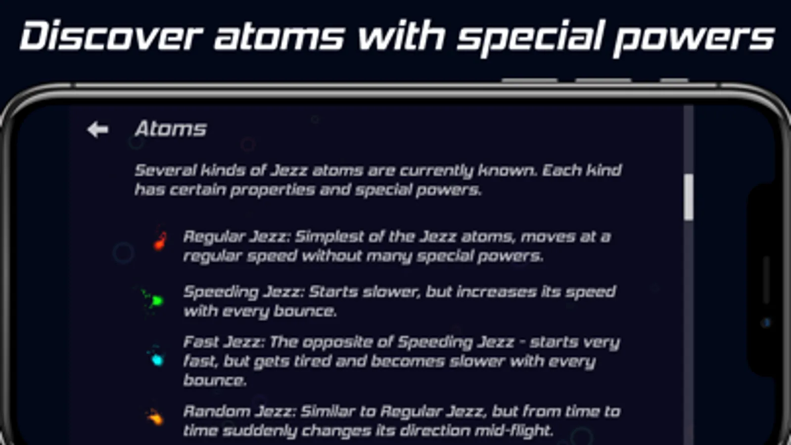 Several kinds of Jezz atoms are currently known. Each kind has certain properties and special powers.