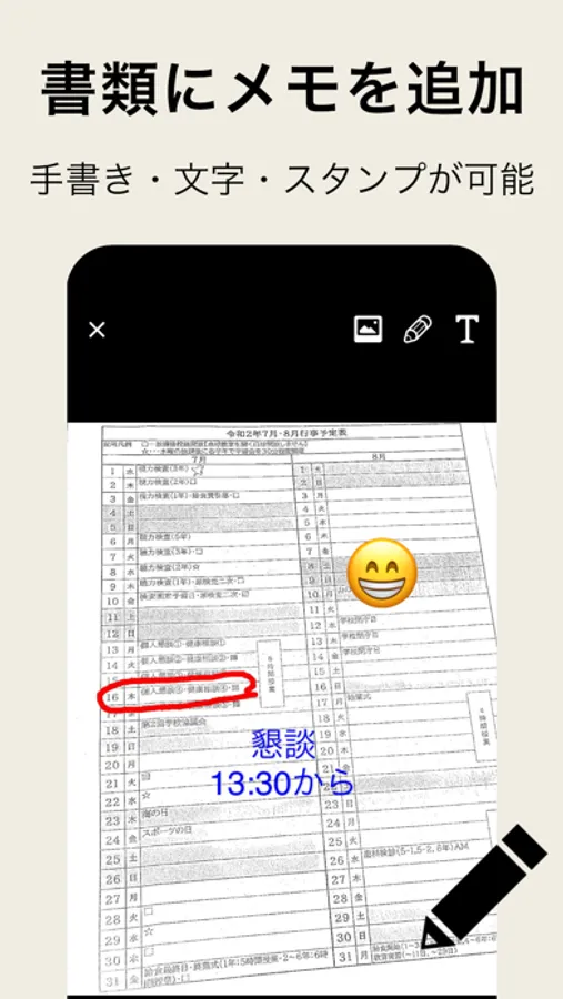 ・保存した書類には手書き、文字入力、スタンプを使用してメモをすることができます。