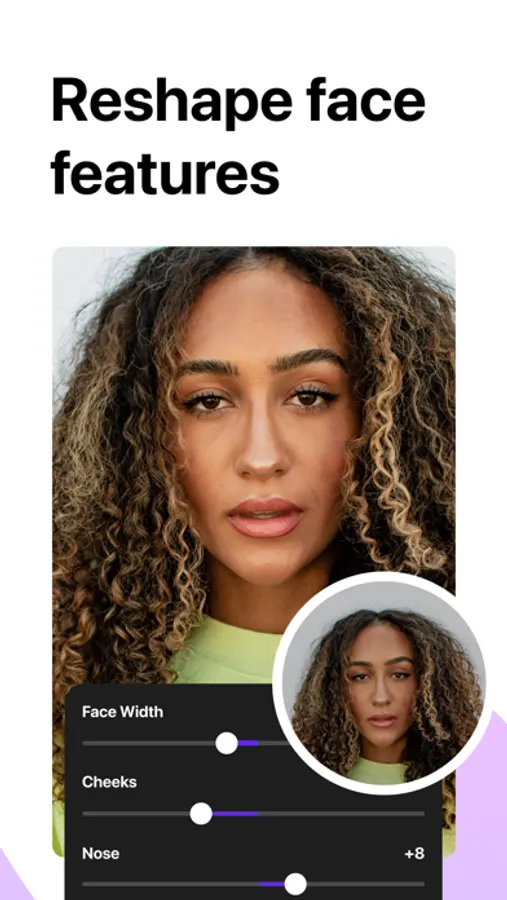 - Easily enlarge or minimize facial features including cheeks, chin, nose, eyes, lips, and much more.