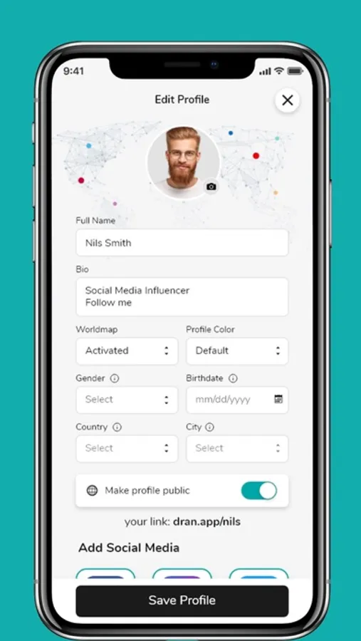 The Dran app enables you to easily access your Dran profile and choose what you share with your Dran Dot. You can customize your Dran profile however you would like by simply using Drag and Drop.