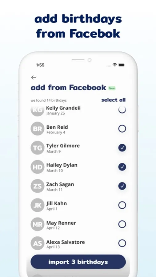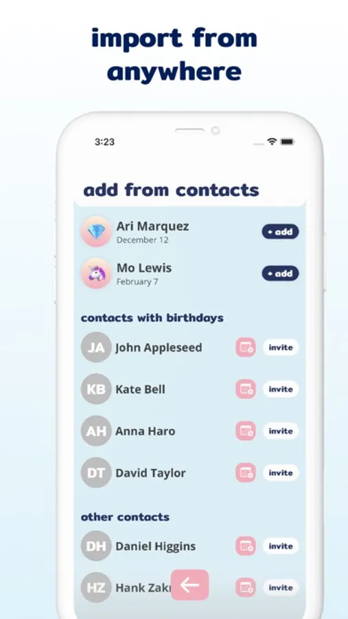 If one of your contacts uses hbd too, their birthday is automatically shared with you, so no need to memorize the birthdays of every person you add.