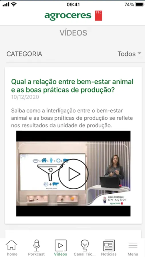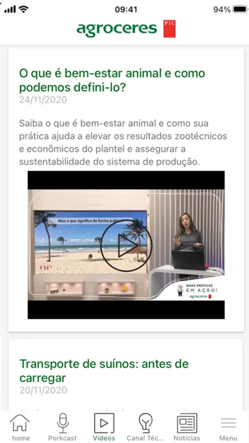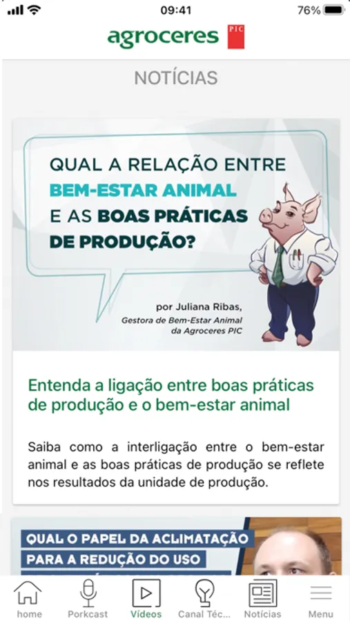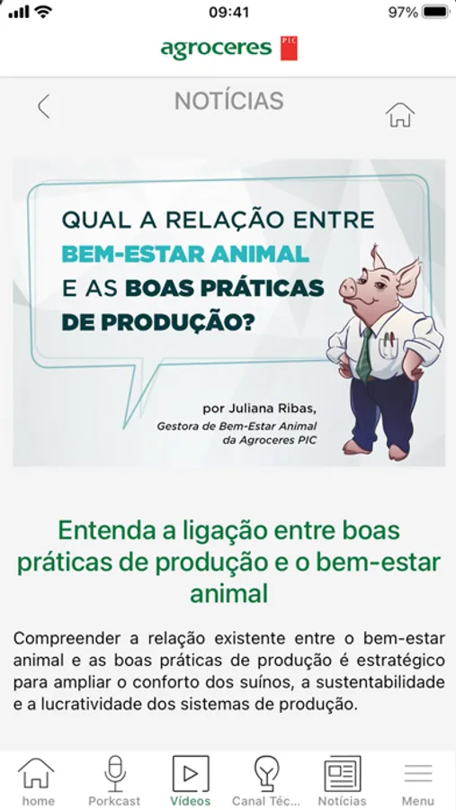 La aplicación Agroceres PIC reúne contenido técnico y educativo. Hay videoclases, entrevistas, podcasts y artículos con información sectorial para aplicación directa en el día a día producción porcina.