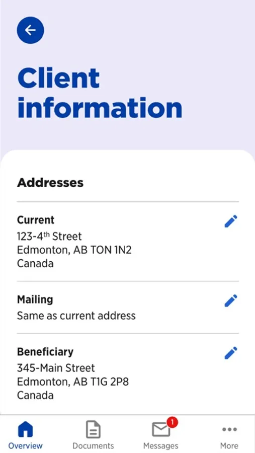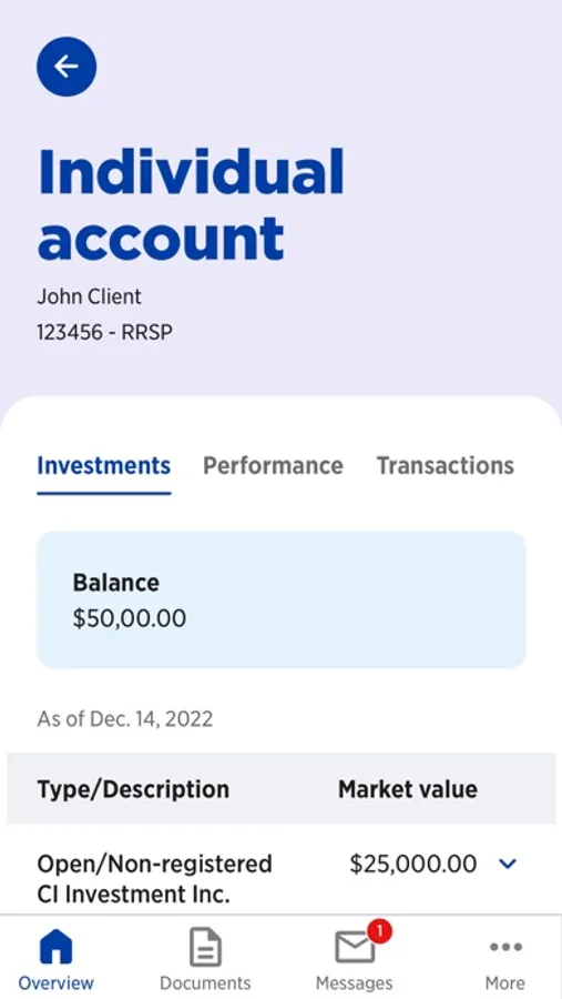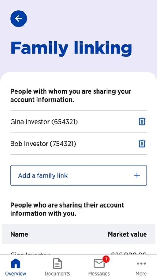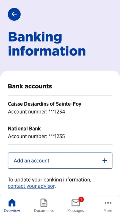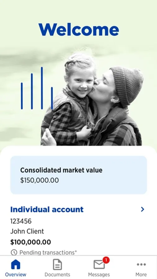 Allows you to view the details of all your accounts, the list of client numbers belonging to the client connected to the application, the consolidated market value of all accounts, including those of family relationships created to share account information with you