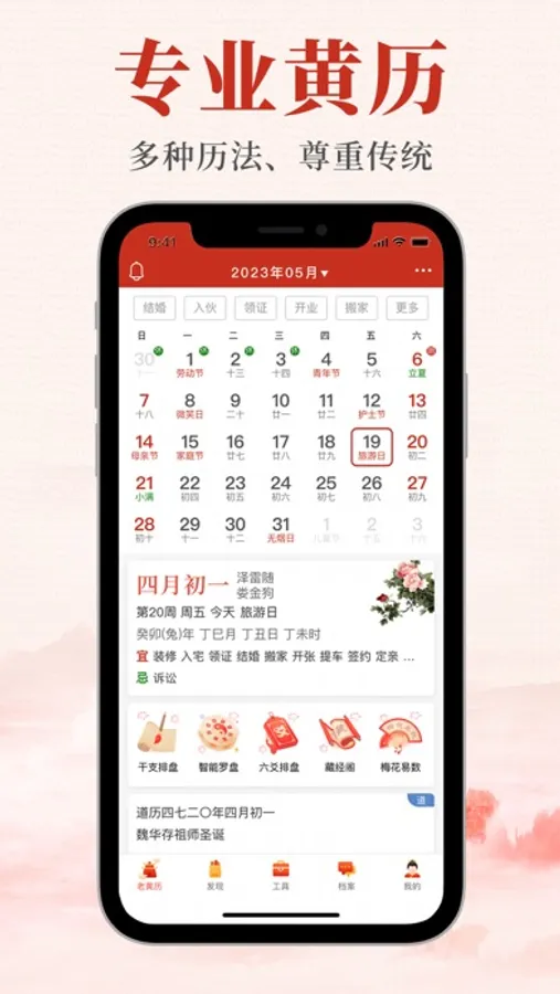 万年历APP主要包含了农历(阴历)、公历(阳历)日期的换算,还有黄历、每日宜忌、时辰宜忌、干支八字查询、吉日查询、五行穿衣、个人运势、星座查询、诸神方位、五行冲煞、建除十二神、彭祖百忌、二十八星宿(28星宿),以及黄历的现代文说明。月视图还能查看法定节假日、24节气等传统节日