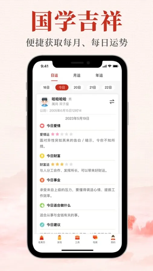通过用户输入自己的姓名、性别、生辰八字,为用户计算属于自己的每日、每周运势。