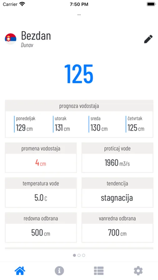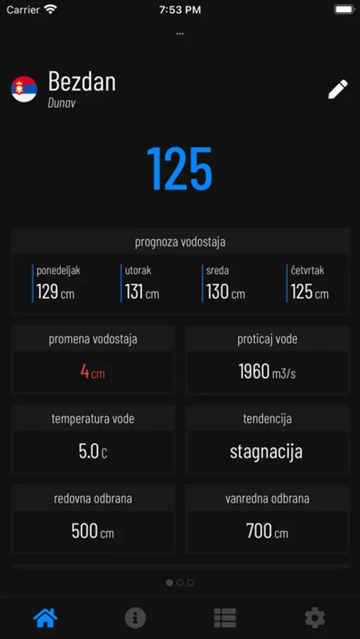 Prognoza vodostaja reka za 2 do 4 dana za 20 stanica na Dunavu, Tisi, Savi i Moravi i hidrološka situacija i tendencije za male i srednje vodotokove u Republici Srbiji. Ažurira se jednom dnevno.