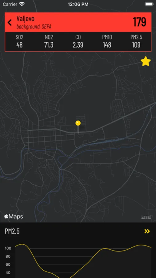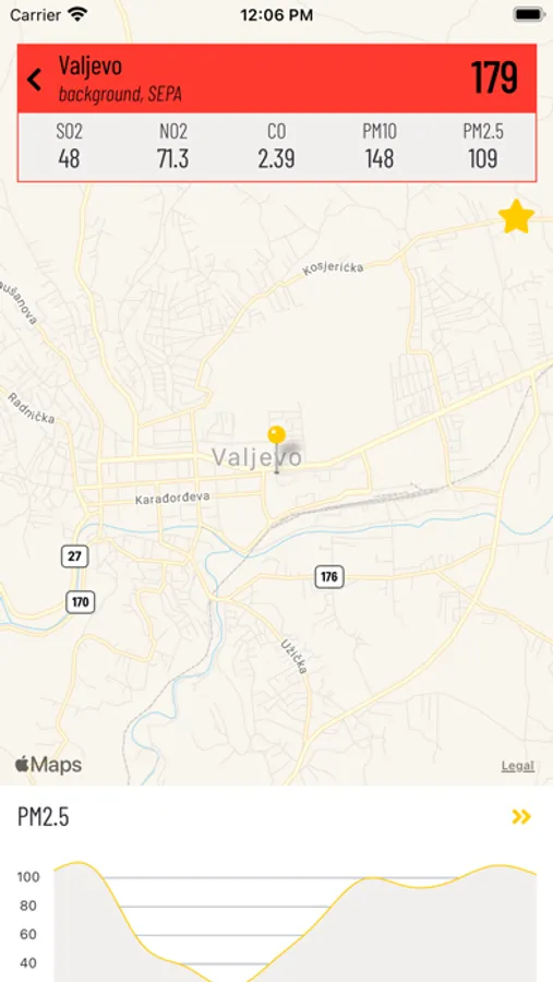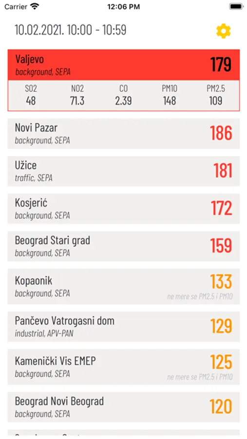 - biranje jedne ili više omiljenih lokacija, kako bi se u listi prikazale poslednje izmerene vrednosti za SO2, NO2, O3, CO, PM10, PM2.5