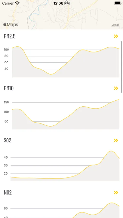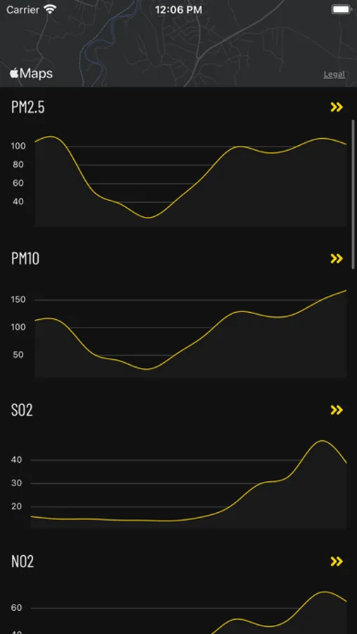 - u zavisnosti od lokacije, prikazuju se grafici izmerenih podataka za SO2, PM10, O3, NO2, NOX, CO, B, Toluene, THC (NM), NO, mp-Xylene, PM2.5, PM1, V, dd, P, t, Rh