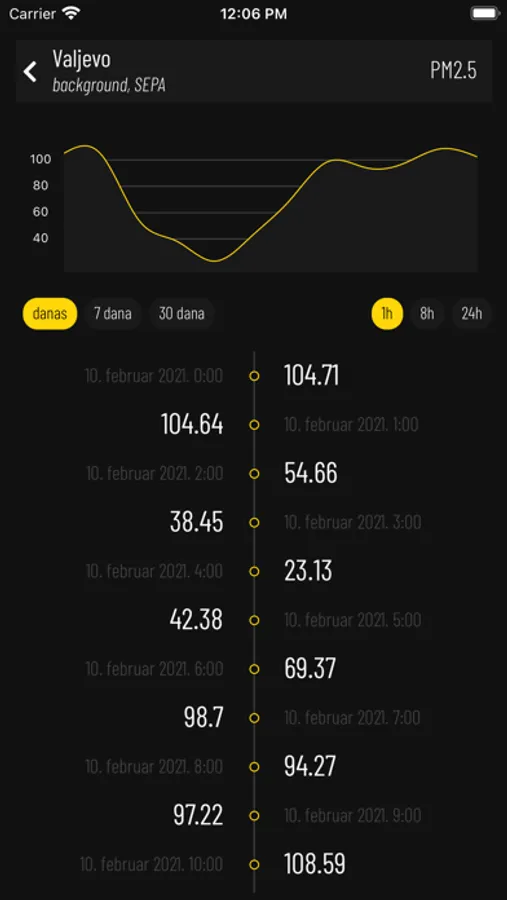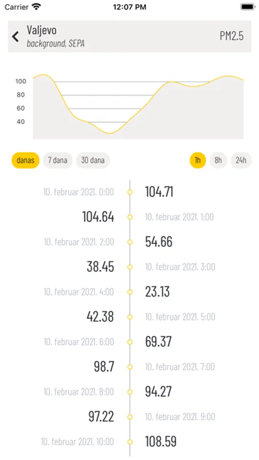 - dostupna je istorija podataka za tekući dan, prethodnih 7 i prethodnih 30 dana, merenih na jedan, osam ili 24 sata